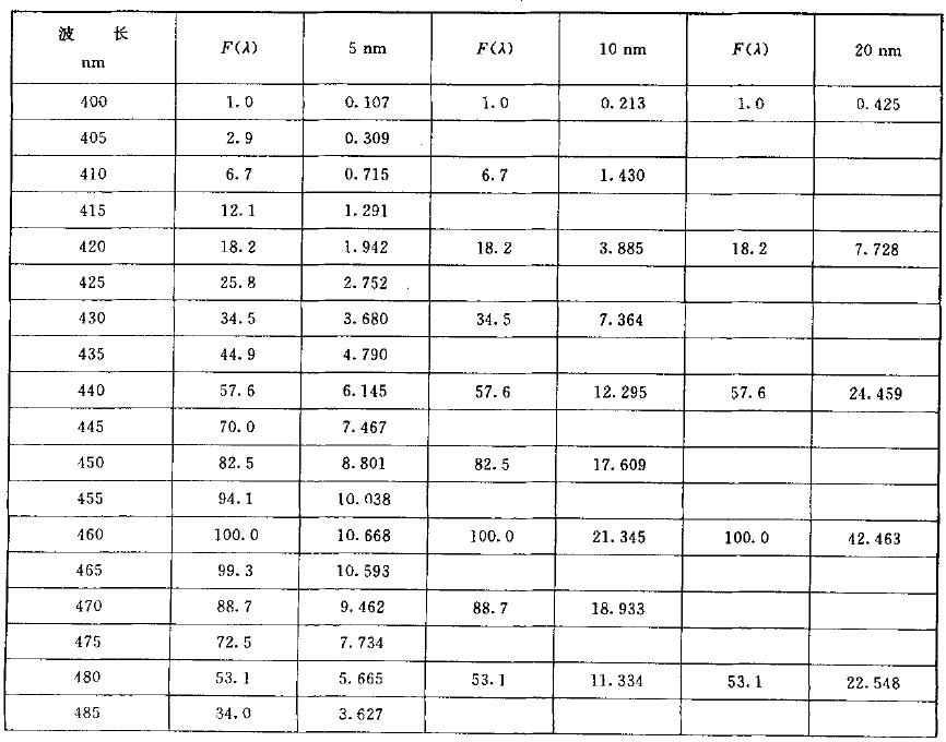與(yǔ)儀器的光源、透鏡(jìng)、積分球壁和接收器的光譜特性相(xiàng)匹配,給出主波長(457士0.5)n m、半波寬44 nm的光譜特性(見附錄A中表(biǎo)Al)。