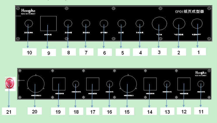 18) 2#抽真空開/關:把幹燥器的水蒸氣通過真空泵抽走(zǒu),到(dào)達快速幹燥紙頁的作用,按下燈亮啟動,燈滅停止。