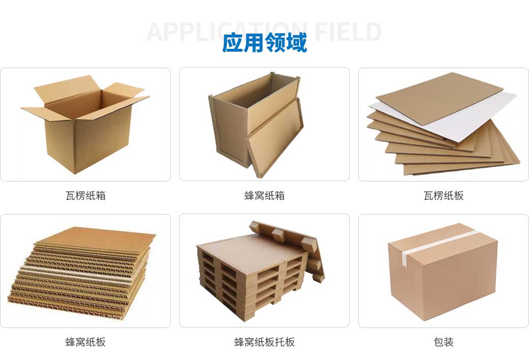 應用領域: 瓦楞紙箱、蜂窩紙箱、瓦楞紙板、瓦楞紙板托板、 蜂窩紙板、蜂窩紙板托板、包裝