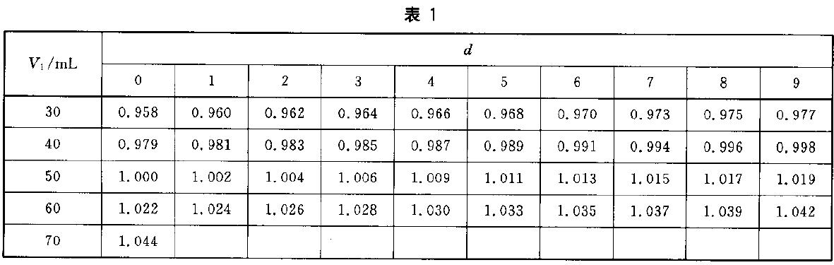 d— 消耗50%(質量(liàng)/質量)高錳酸鉀(jiǎ)的校正因子,d依V,值而確定(見表1);