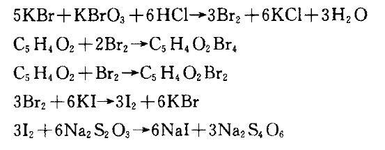 含糠醛的溶液在(zài)室溫下與過量澳作用 1h,則 1m ot糠醛可與4.0 5m ot澳原子化合,稱為四澳(ào)化法。