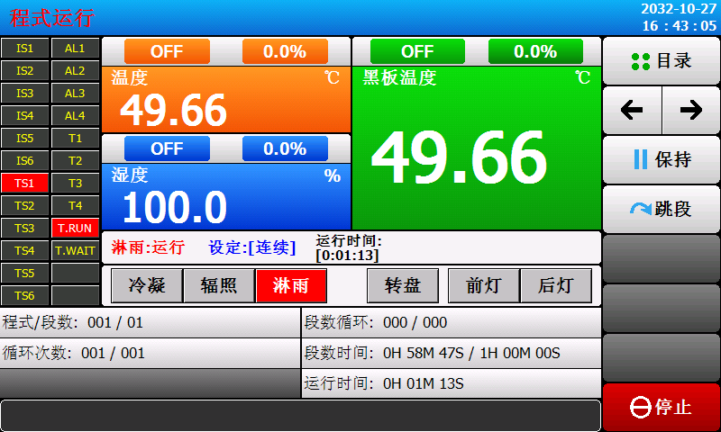 6.试验箱的温度由固(gù)定有宽75㎜、高100㎜、厚2.5㎜.黑色铝板(黑板)上的传感(gǎn)器(qì)进行测量,该黑板应放置于曝露试验的中心区域,温度计的(de)测量范围为30~80℃,容差为±1℃.光照和冷凝阶段的控(kòng)制应单独进行(háng),冷凝阶段由加热水温进行控制。